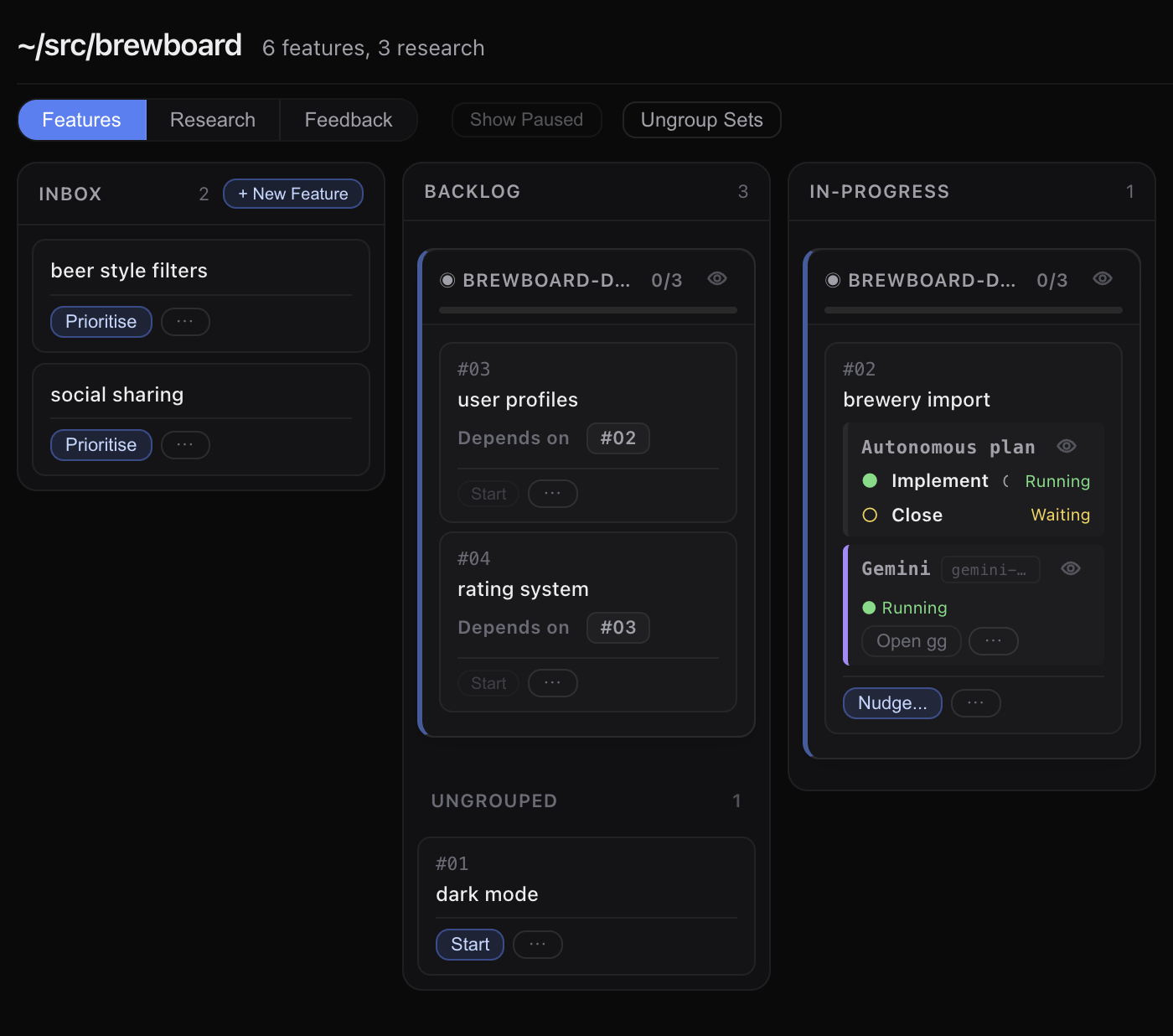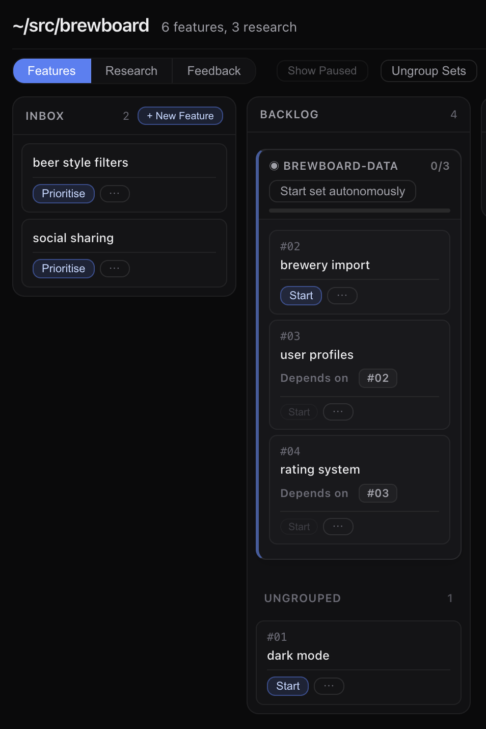 The best way to understand feature-set autonomy is to start it from the dashboard and watch the members complete one at a time.