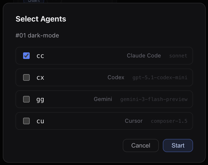 In the Pipeline view, find feature 01 — Dark Mode in the Backlog column. Click Start on the card — a picker appears where you select one agent to drive the implementation.