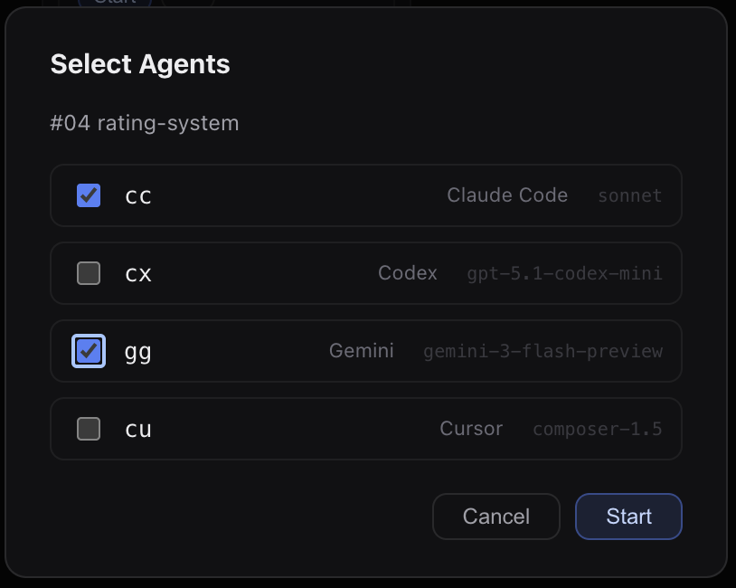 Fleet mode runs two agents on the same feature simultaneously. Find feature 04 — Rating System in the Backlog. Click Start and select two agents (e.g. Claude Code + Gemini CLI).