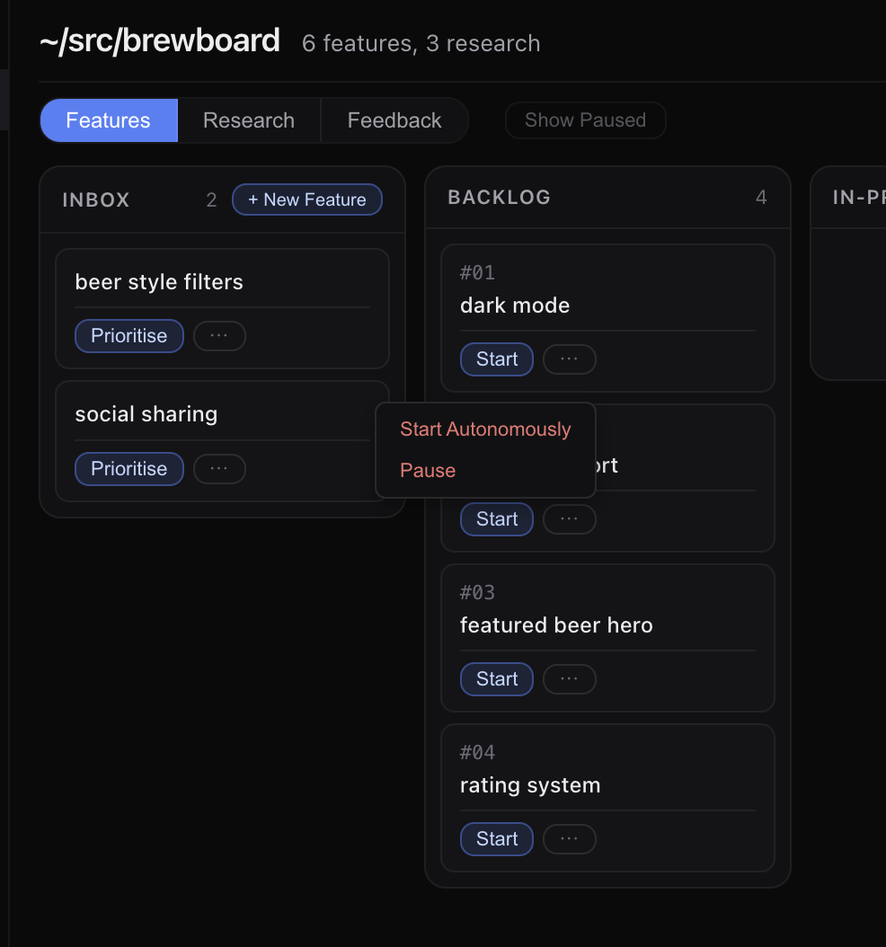 aigon server add ~/src/brewboard # register the repo with the dashboardOpen http://localhost:4100 . You’ll see the Brewboard repo in the sidebar and its six features spread across the pipeline.