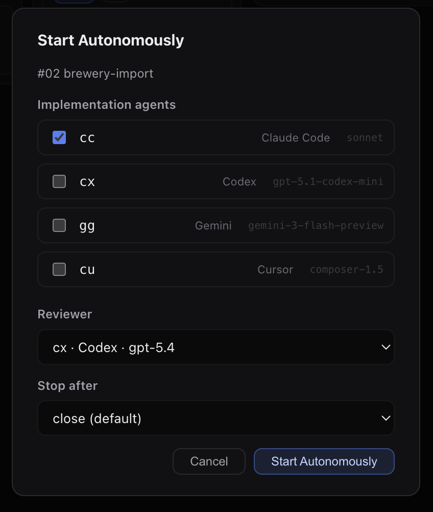 A modal appears where you select an implementation agent, a reviewer, and when to stop. The default stop point is after close — the full lifecycle runs unattended.